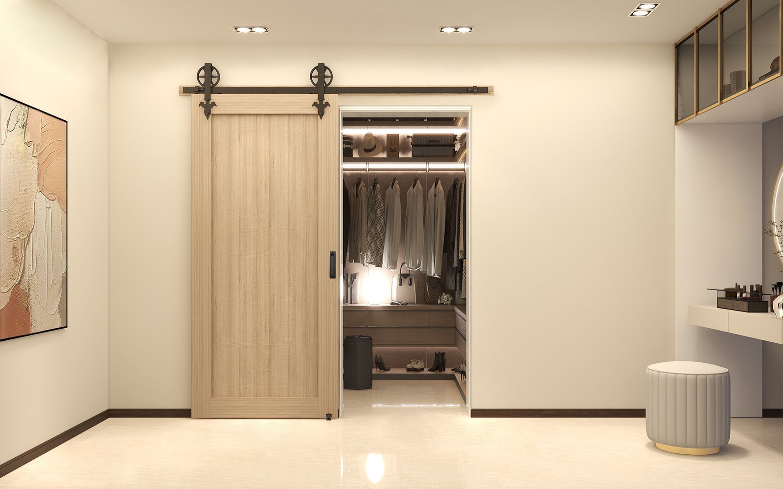 Ensure that the barn door provides sufficient clearance on both sides of the opening when fully open. This prevents the door from obstructing adjacent walls, furniture, or other elements in the room. Consider the space required for the door to swing open comfortably without causing any inconvenience.